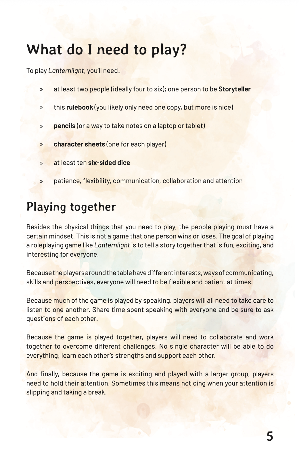 Lanternlight grew out of the games that we played as a family. It's designed to be flexible, creative, narratively-focused, and quick to learn. If you're looking for a game that you can play as a family, Lanternlight is a great place to start.